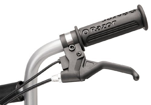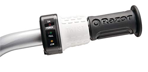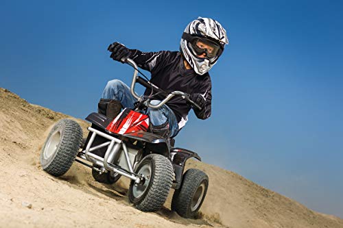 Details: Product Description Dirt Quad From the Manufacturer Razor Dirt Quad: When the backyard becomes too groomed and the sidewalk too smooth, the Dirt Quad enters with unlimited adventure. Another icon in Razor's line of electric powered off-road vehicles, the four-wheel Dirt Quad is built strong and sturdy to conquer tough trails and big bumps. Don't compromise adventure. Features a high torque motor and gearing with twist-Grip acceleration control and hand operated rear disc brake, 13" pneumatic knobby tires, front brush bar, adjustable riser handlebars, droop travel rear suspension with coil shock, up to 40 minutes of continuous use, and rear carry handle with space saving vertical storage capability. Also includes, shatter-resistant plastic fairings and powder coated tubular frame for all weather durability, and 24V (two 12V) sealed lead acid rechargeable battery system with charger. 12 hours recommended battery charge time. Recommended for ages 8 and older and will support a rider up to 120 pounds. The buyer and rider of the Razor Dirt Quad are responsible for knowing and obeying all local, state and federal regulations regarding the riding and use of all Razor electric vehicles and scooters.